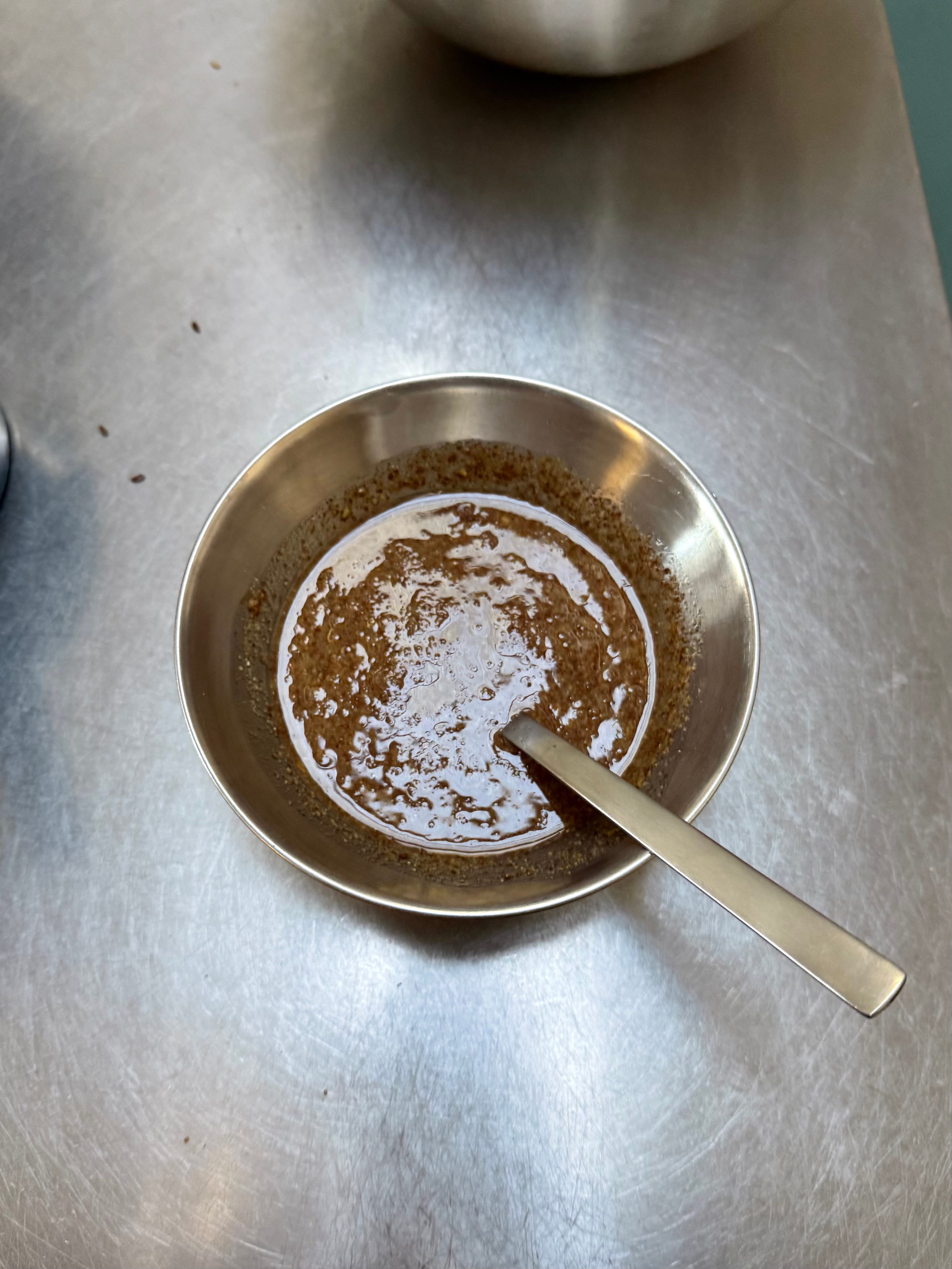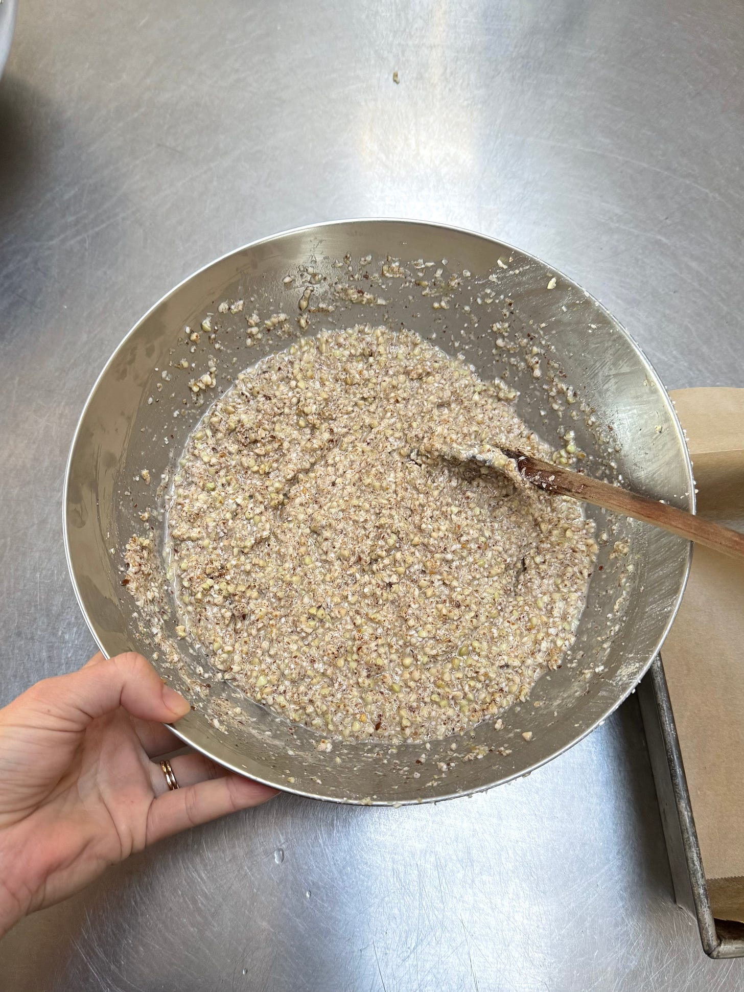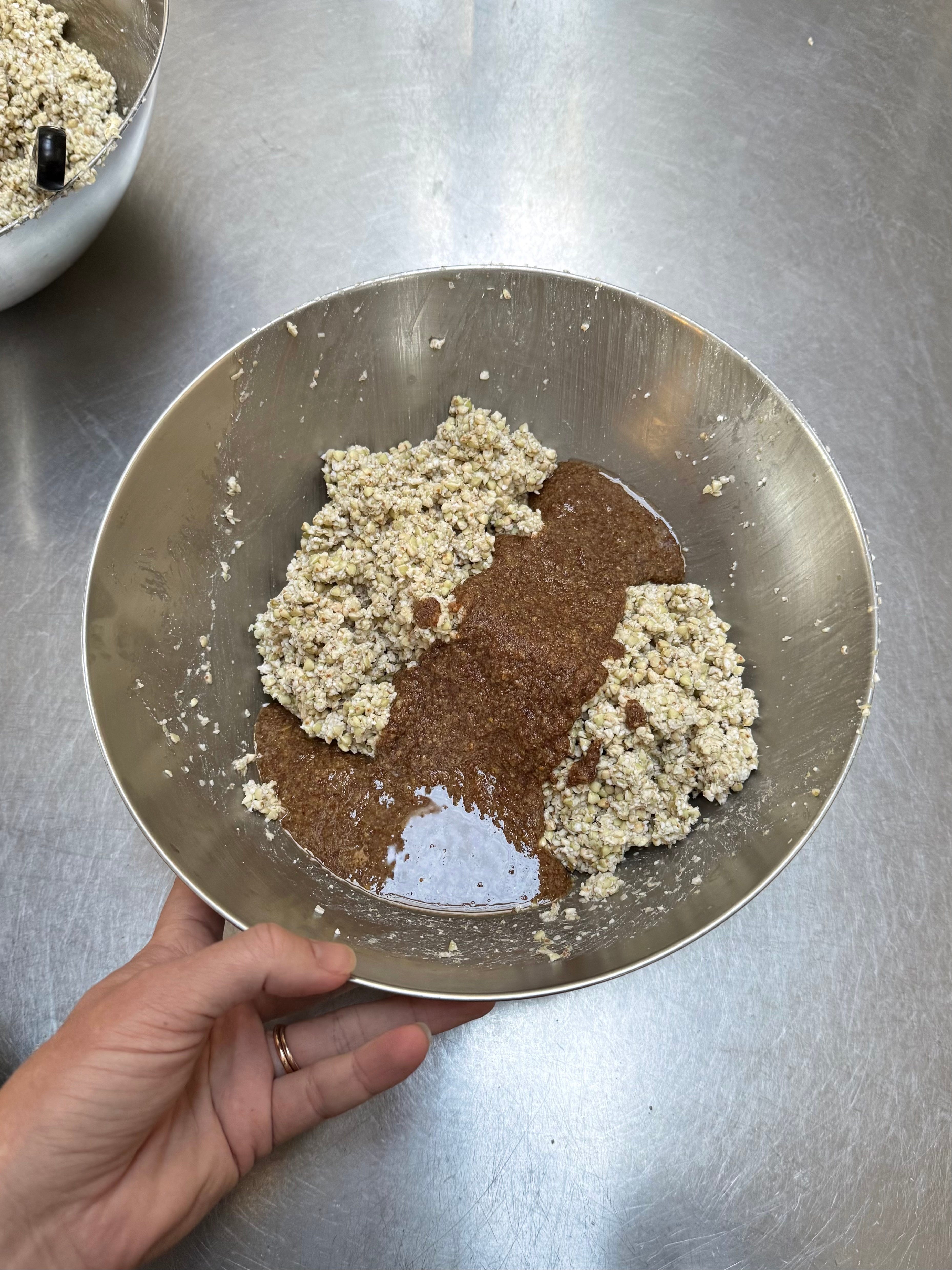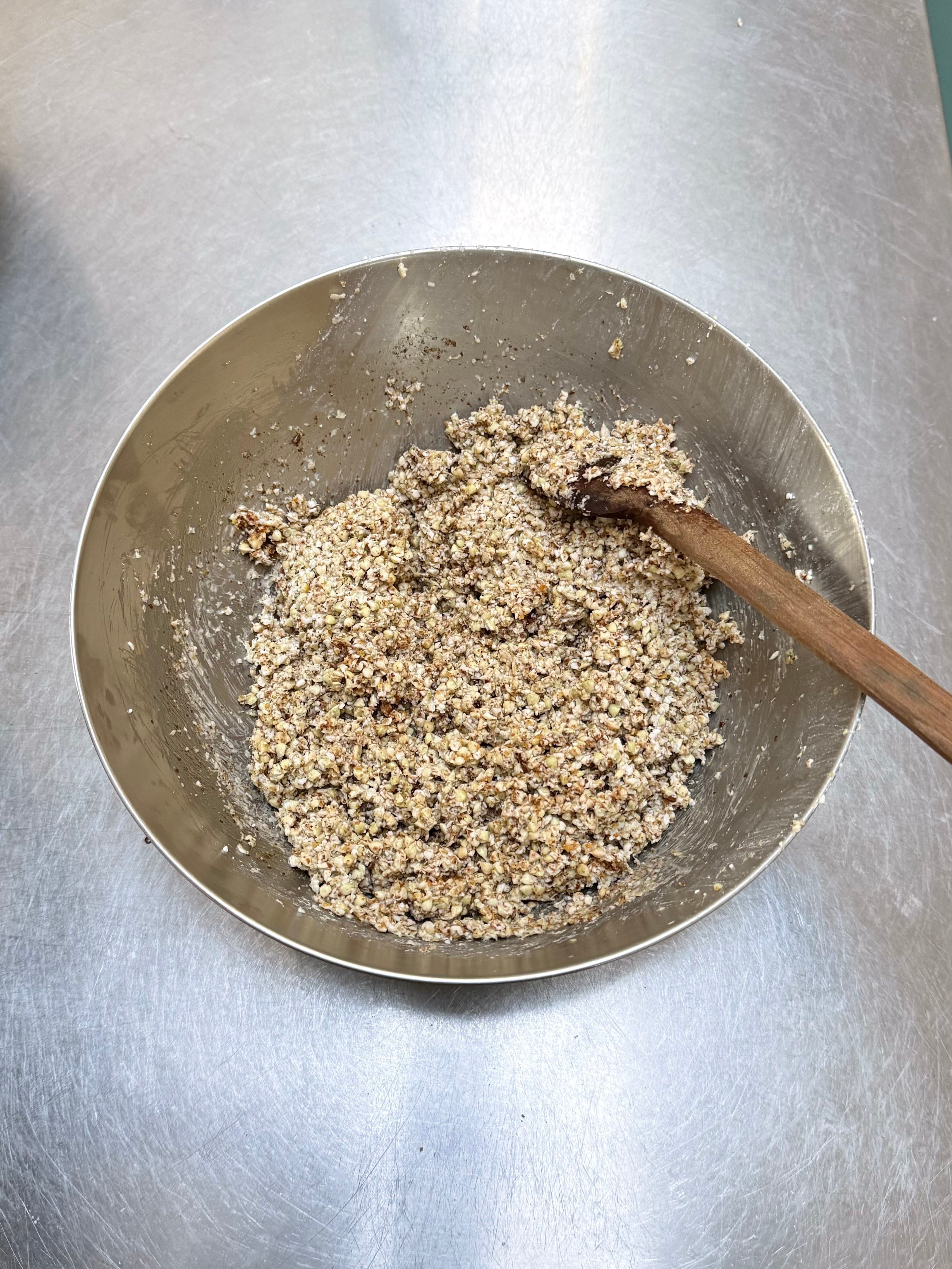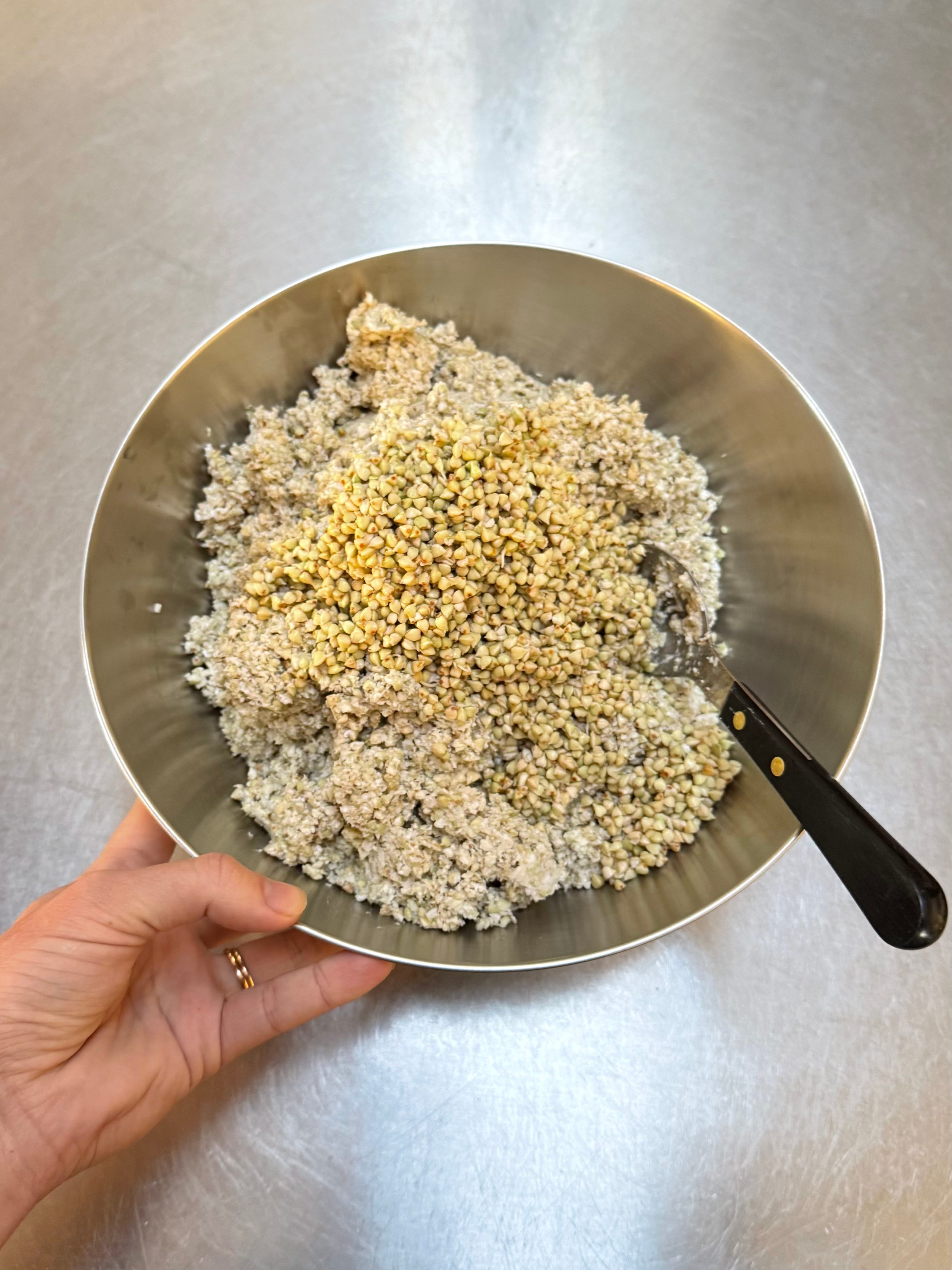 Pour half a cup of water over the buckwheat and stir together. The texture of the dough should be the texture of porridge. If it isn’t, add a little more water until it resembles porridge. It will be quite sloppy but this is correct.