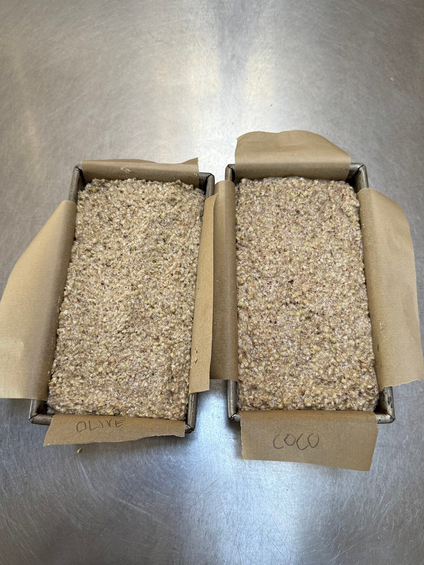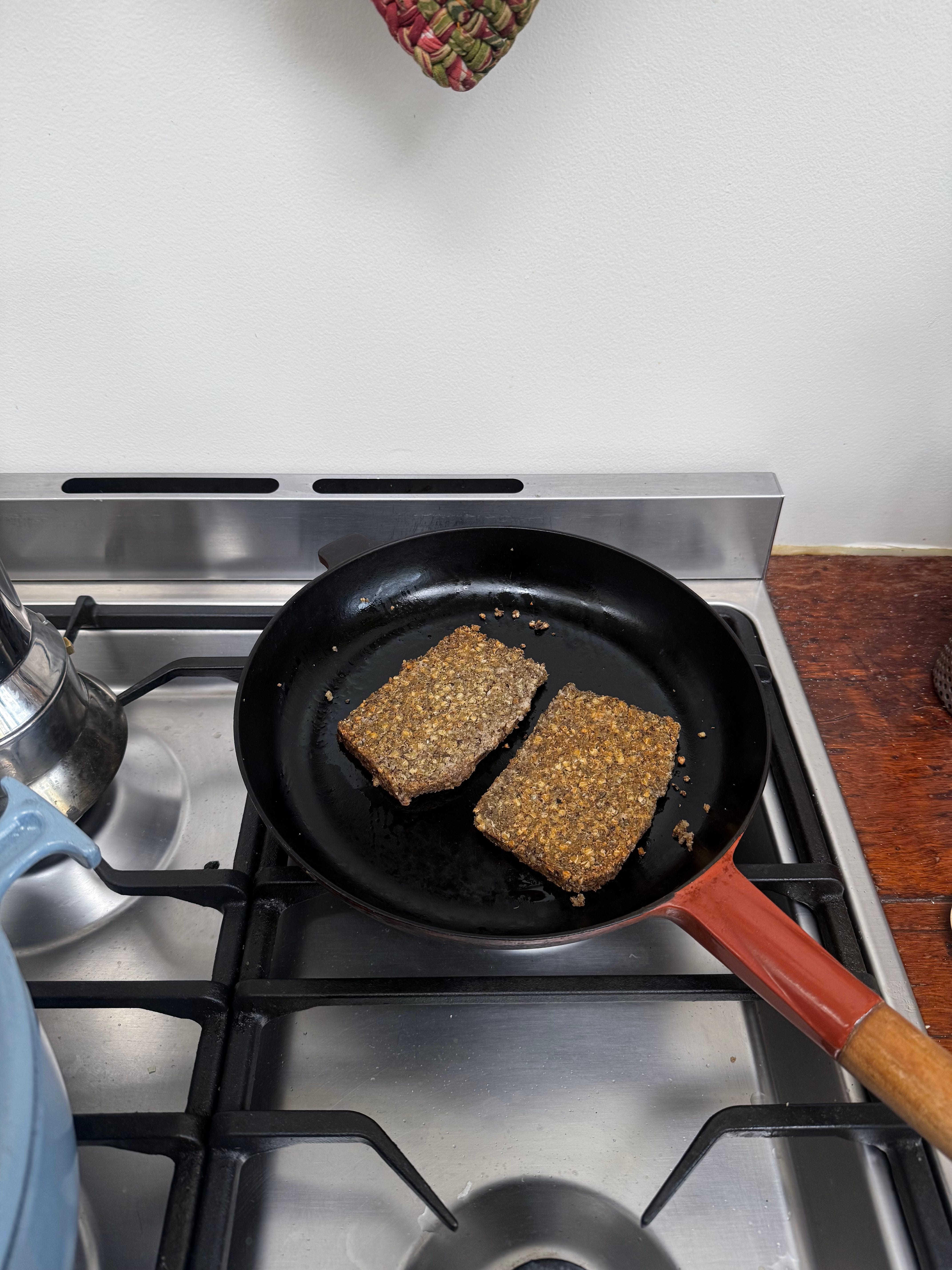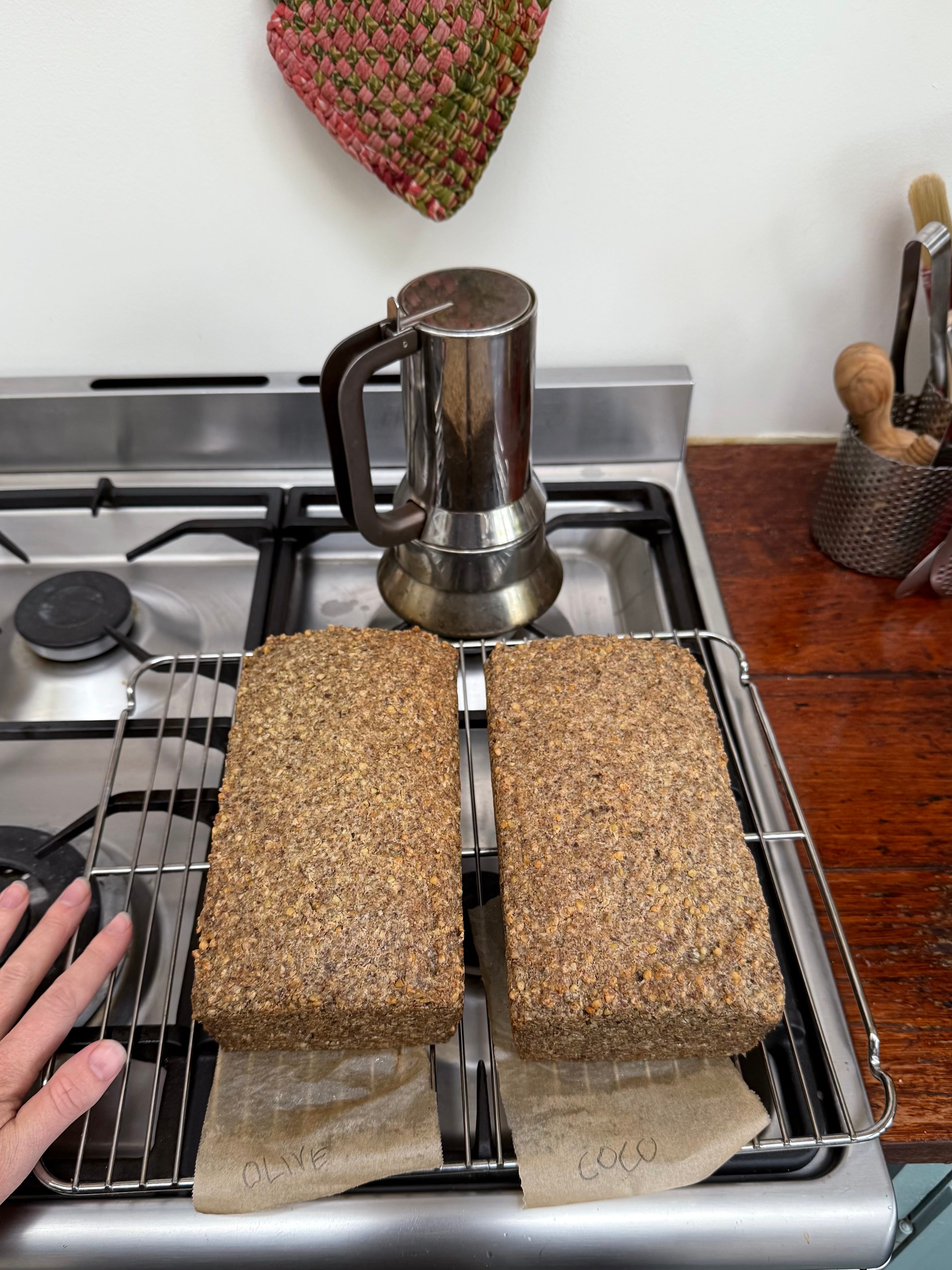 I started making this bread over ten years ago when I went through a phase of eating super healthy. I then turned it into a small business and sold it to the café I was working for in Auckland. I would sprout the buckwheat in a huge commercial sprouter, and Harry or my brother Fergus would help me starting at 4 in the morning. When I opened my own shop a few years later, I started selling it from there along with my seeded sourdough loaf. I would sprout the buckwheat in large buckets in my little kitchen and make up 40 loaves at a time. This bread is kept in the fridge, and as it cools down, it is easier to slice. It is best to cook 2 loaves at a time as you can also slice and freeze it, and it’s always eaten when toasted. I enjoyed the taste of buckwheat and still enjoy eating it even though I eat normal bread too.