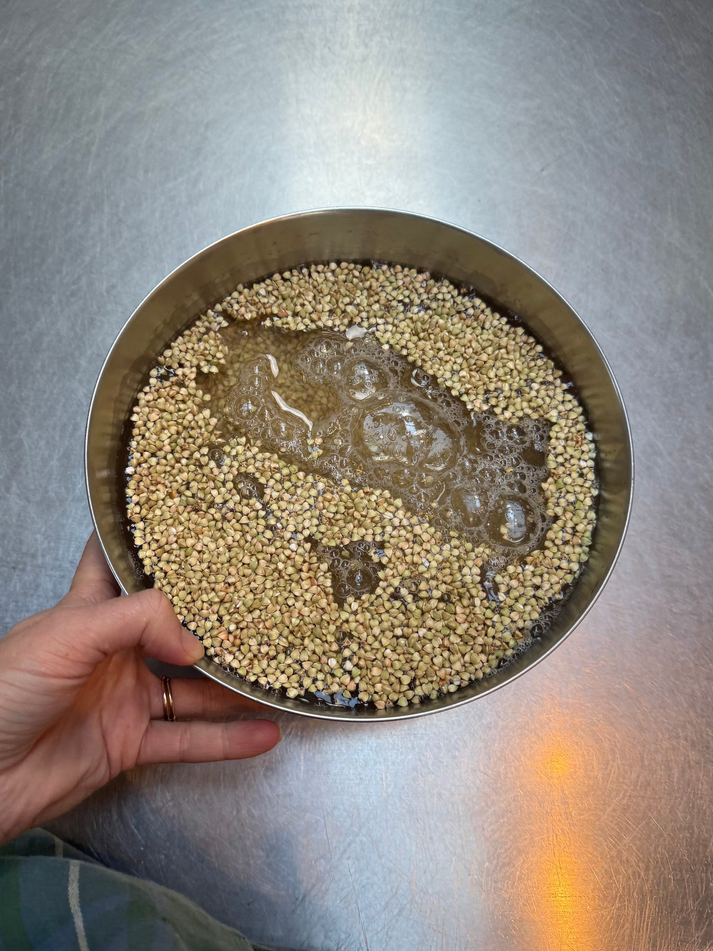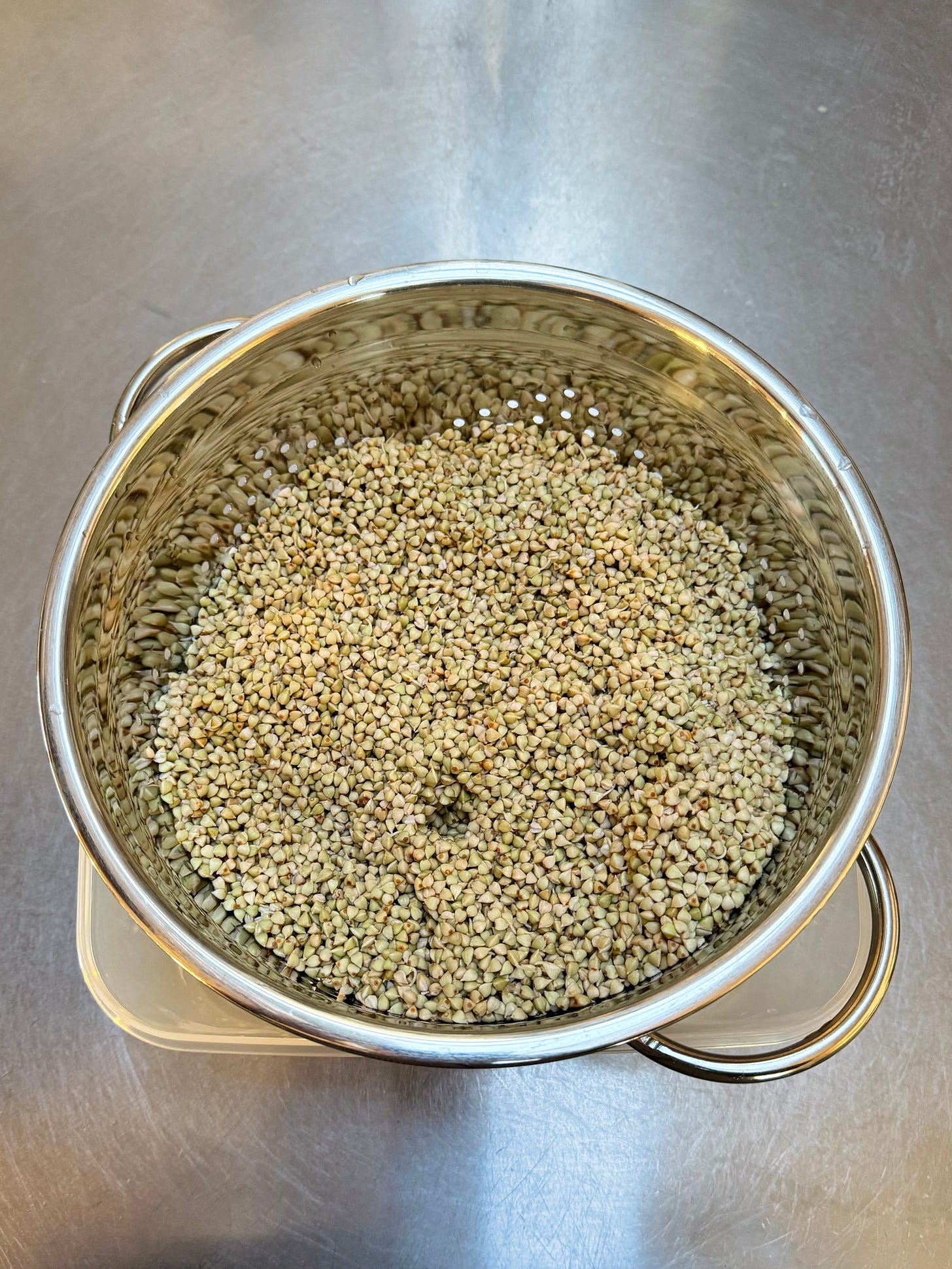 The next day, rinse the buckwheat thoroughly again. Now the buckwheat should have sprouted and grown little tails, and it is ready to make the bread.