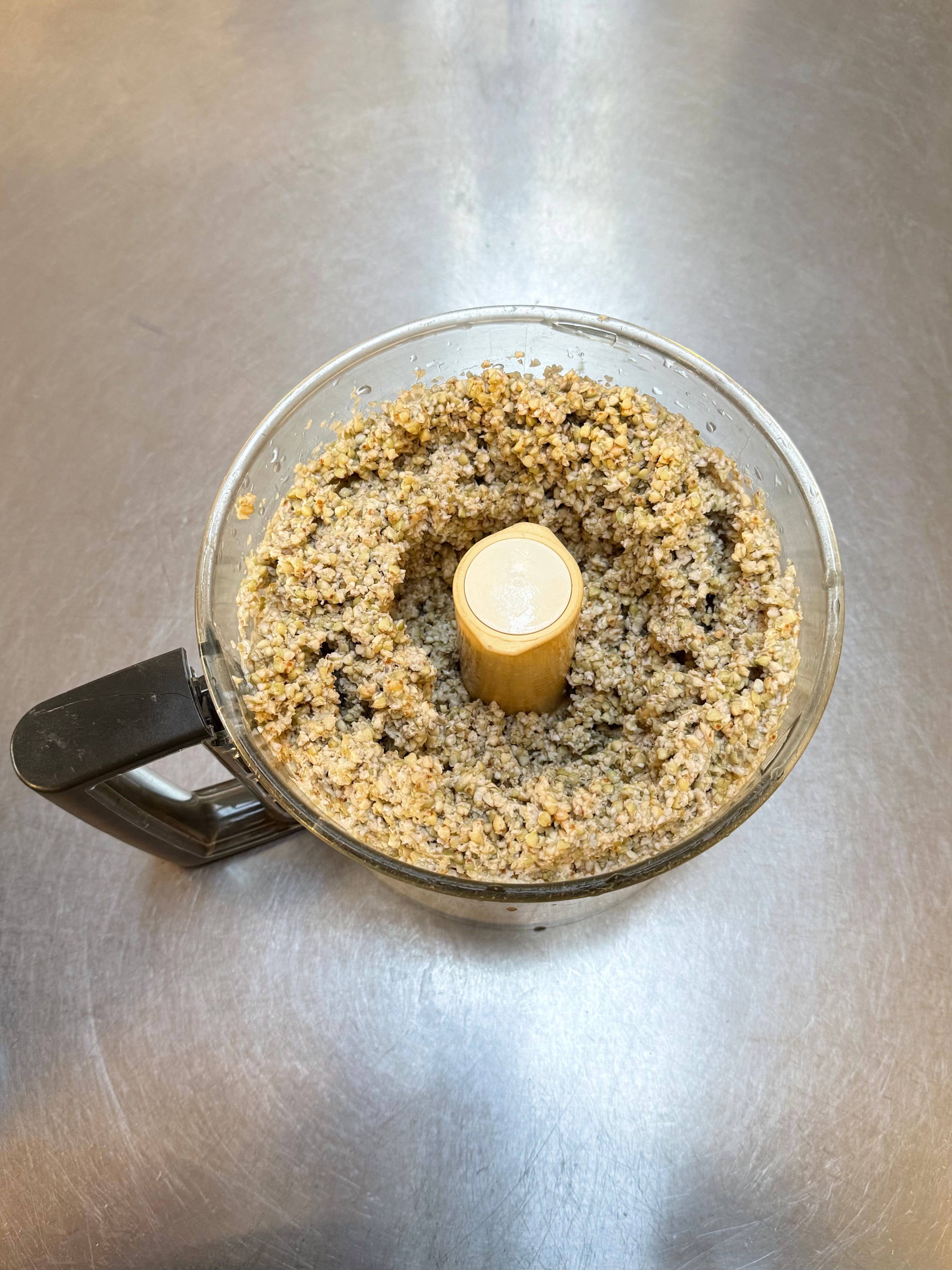 Put the buckwheat inside a food processor and pulse it a few times to break up the sprouted buckwheat. If you don’t have a food processor, a hand blender should work too.