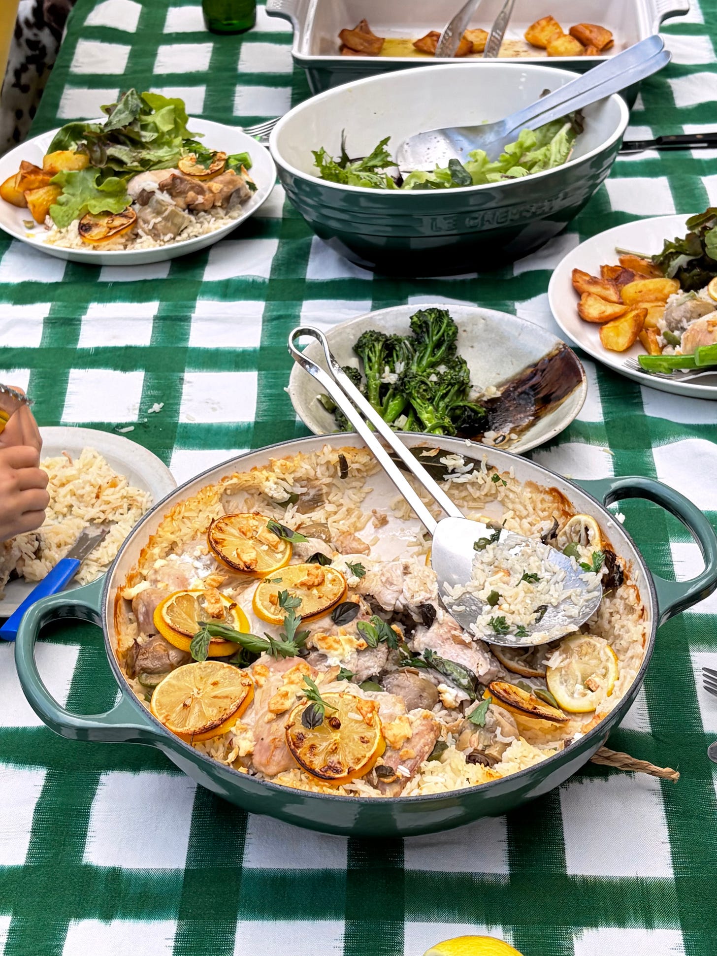 In a heavy-bottomed cast iron pot, combine the rice, olive oil, and a pinch of salt. Stir with a wooden spoon until the oil coats the rice. Finely chop the garlic and add it to the pot along with the artichokes, green olives, lemon zest, juice, stock, and a generous pinch of salt. Stir everything together and then place the browned chicken thighs on top, pouring any juices from the chicken pan into the pot if there are any. I like to add a few slices of lemon on top and then scatter the feta cheese around the pot.
