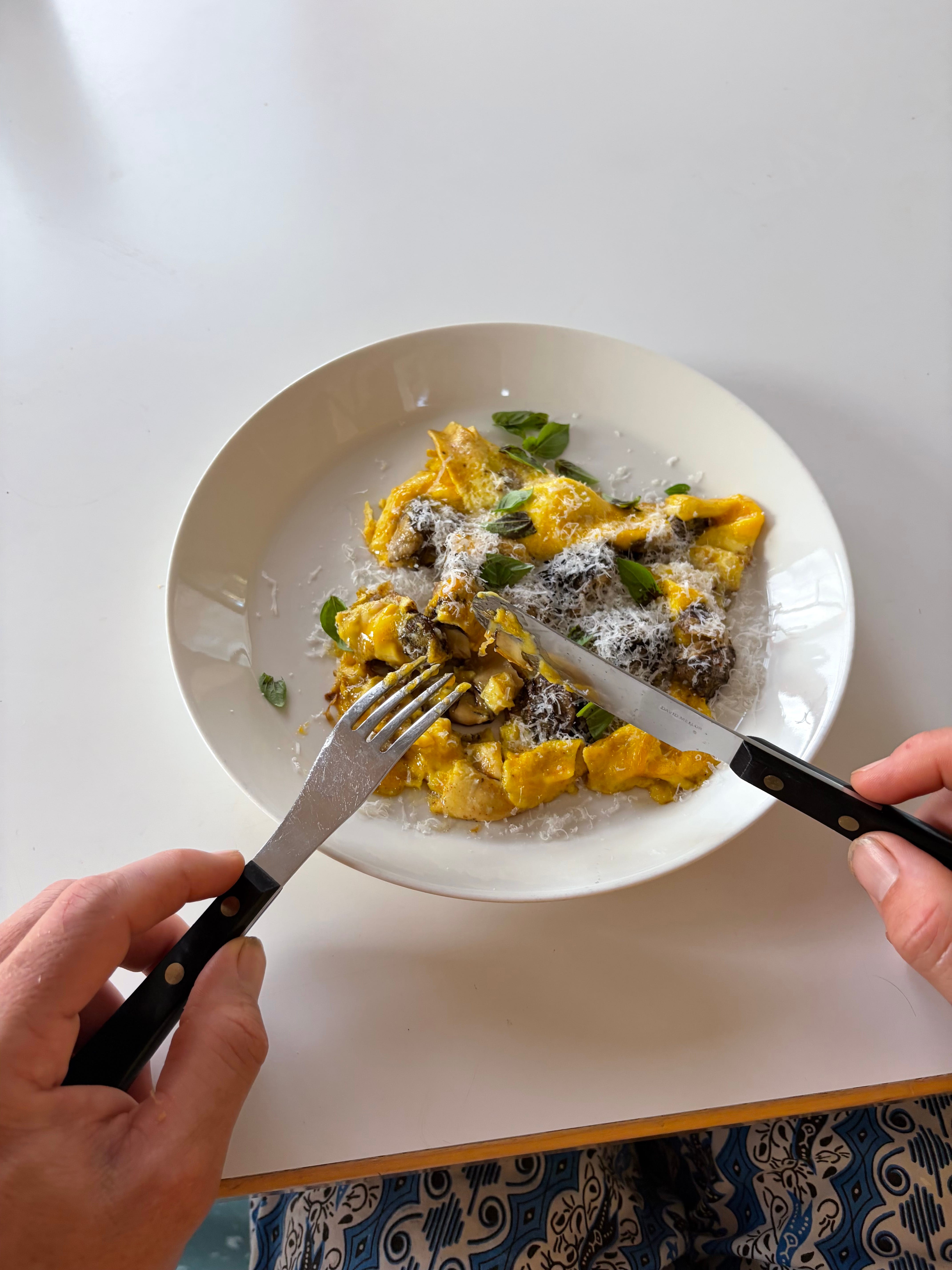 Pour the eggs into the pan and let them sit. Add the artichokes in the centre of the omelette. Watch the eggs and when one side is able to be lifted up with a spatula, fold the omelette onto itself. You don’t need to fold it in half, just over the artichokes as much as you can. Then wait for the other side to be able to be folded over. You don’t want to overcook the omelette, so it will require your full attention and take a bit of practice.